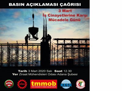Bundan tam 28 yıl önce 3 Mart 1992 tarihinde, Zonguldak Kozlu Kömür Ocağında meydana gelen grizu patlamasında hayatını kaybeden 263 emekçi anısına TMMOB, Ülkemizdeki iş cinayetlerine dikkat çekebilmek, işçi sağlığının ve iş güvenliğinin önemini vurgulamak için 3 Mart tarihini, “İş Cinayetlerine Karşı Mücadele Günü” olarak ilan etmiştir. 3 Mart “İş Cinayetlerine Karşı Mücadele Günü” kapsamında Adana İl Koordinasyon Kurulu, Adana Barosu, DİSK, KESK ve Türk Tabibleri Birliği olarak ortak basın açıklaması düzenlendi. Basın açıklamasını Şube Başkanımız Mehmet YILMAZ yaptı.