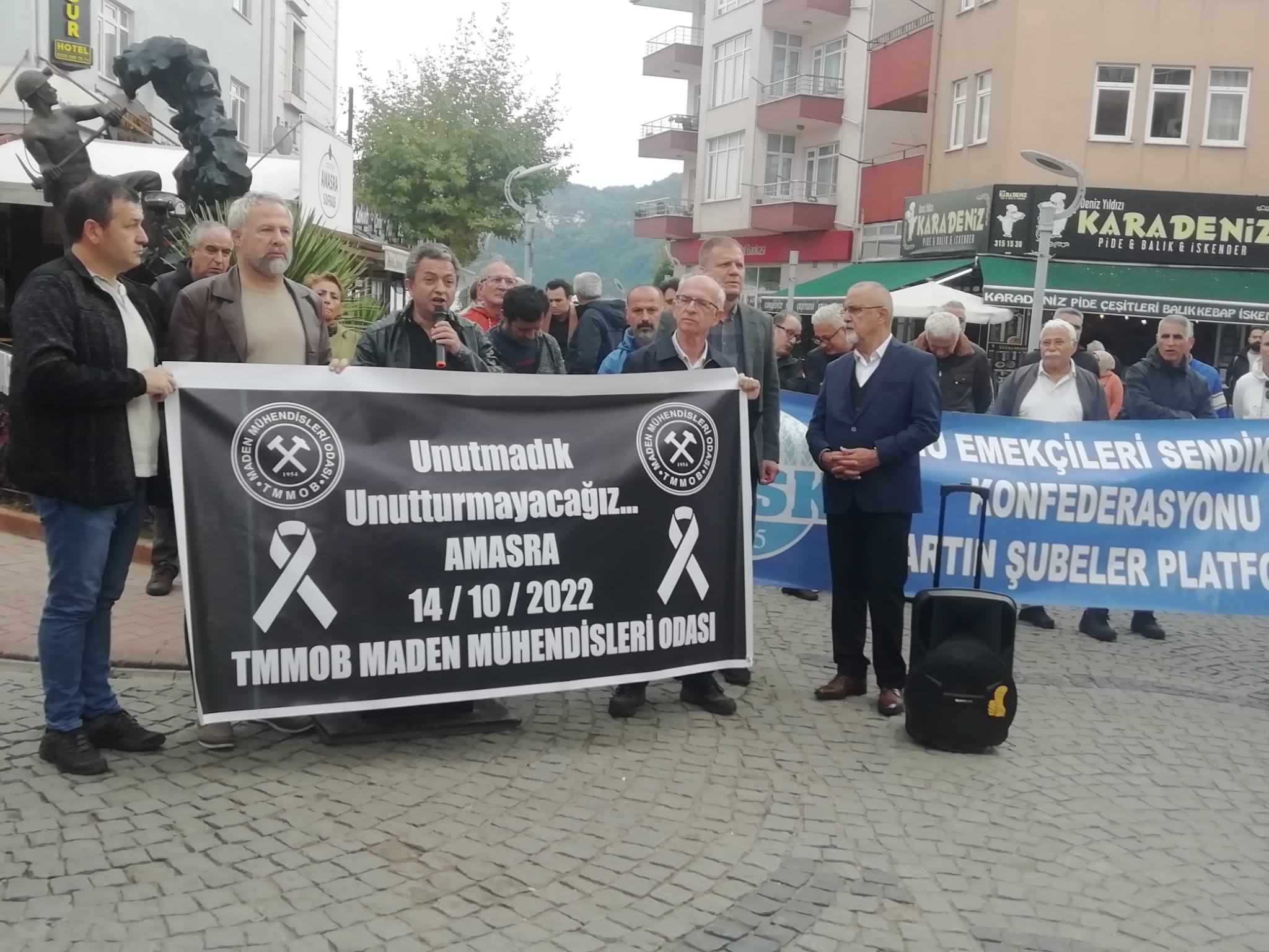 Amasra faciası'nın birinci yılında Odamız Yönetim Kurulu Başkanı Ayhan Yüksel Amasra Maden Şehitleri Anıtı önünde açıklamada bulunmuştur.