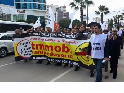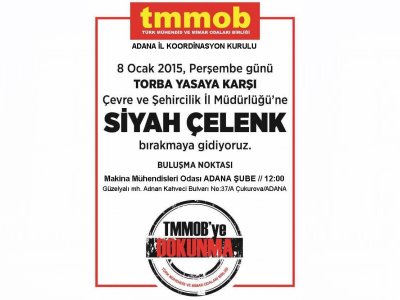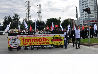 TMMOB`ye bağlı oda başkanlarının da katıldığı yürüyüş esnasında torba yasa tasarısına karşı çeşitli sloganlar atıldı. Çevre ve Şehircilik İl Müdürlüğü tabelası önüne oda ve sivil toplum örgüt başkanlarıyla birlikte siyah çelengi bırakan TMMOB Adana İKK Sekreteri Hasan Emir Kavi, "Torba yasalarla altyapısı hazırlanan yalana, talana, yıkıma, yağmaya izin vermeyeceğiz" dedi.