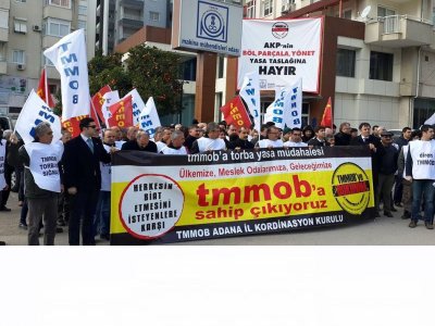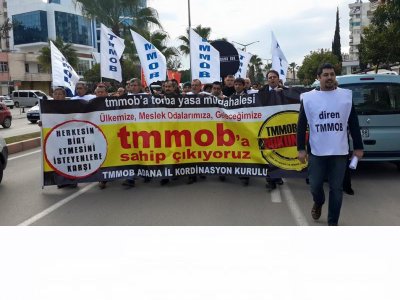 Şimdi Çevre ve Şehircilik Bakanına sesleniyoruz; hazırladığınız yasa değişikliği, meslek alanlarımızın ve örgütümüz TMMOB`nin tüm birikimlerini halkımızın yararına kullanmaya, AKP iktidarının yarattığı rant düzenini teşhir etmeye, ülkemizi aydınlık geleceğe taşımak için var gücümüzle çalışmaya devam etmemizi engelleyemeyecektir. Unutmayın ki; siz TMMOB`yi yok etmeye çalışsanız da TMMOB her yerde…TMMOB Soma`da; Ermenek`te, Zonguldak`ta; TMMOB, Atatürk Orman Çiftliği`nde; TMMO suyumuzun ticarileştirilmesine karşı Karadeniz`de, Akdeniz`de, Ege`de; TMMOB, Alakır vadisinde, Artvin Cerattepe`de, Yırca`da, Diyarbakır Hevsel bahçelerinde, Burdur`da, Bartın`da, Sakarya Karasu`da; TMMOB, Taksim`de, Gezi`de, Anadolu`da, kentte, kırda bu ülke insanının yaşadığı her yerde…