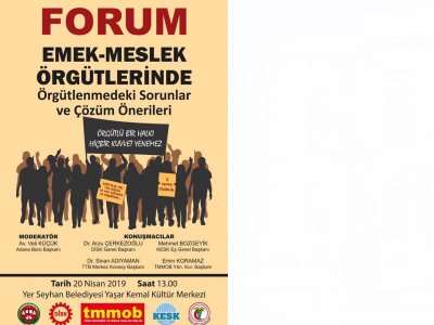TMMOB Maden Mühendisleri Odası Adana Şubesi olarak, Adana İl koordinasyon Kurulu tarafından 20 Nisan 2019 tarihinde düzenlenen Emek-Meslek Örgütlerinde Örgütlenmedeki Sorunlar Ve Çözüm Önerileri Forumuna katıldık.