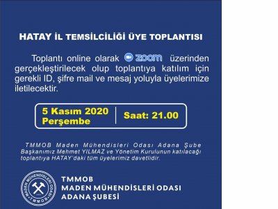 TMMOB Maden Mühendisleri Odası Adana Şube Başkanımız Mehmet YILMAZ ve Yönetim Kurulunun katıldığı HATAY İli üye toplantısı, 5 Kasım 2020 Perşembe günü Saat: 21.00 ‘de online olarak ZOOM üzerinden gerçekleştirildi. Toplantının açılış konuşmasını yapan Adana Şube Başkanımız Mehmet YILMAZ, Şube faaliyetleri, Hatay yangını, son günlerde bölgemizde gelişen madencilik hakkında bilgilendirme, üyelerimizin özlük hakları ile ilgili bilgi verdi. Devamında Hatay İl Temsilcimiz Talat KAZAN son günlerde bölgede meydana gelen orman yangınları ve madenciliğe yapılan saldırılar hakkında bilgi verdi. Üyelerle soru cevap şeklinde devam edilen toplantı verimli bir ortamda sonlandırıldı.