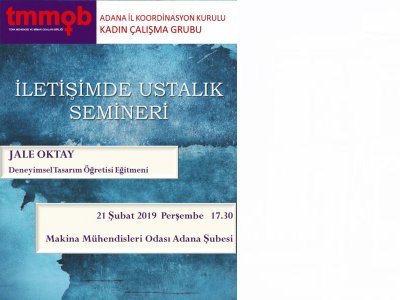 Şube Yazmanımız Elif DİNÇER ve Şubemiz Kadın Komisyonu üyelerimiz Ülfet KEÇİOĞLU ve Süreyya KÜKÜRT, TMMOB Adana İl Koordinasyon Kurulu Kadın Çalışma Grubu tarafından, 21 Şubat 2019 Perşembe günü düzenlenen İletişimde Ustalık Semineri ‘ne katıldılar.