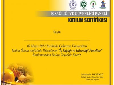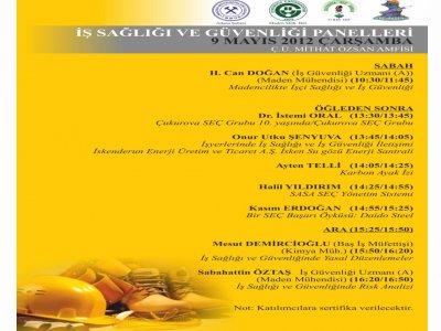 09 Mayıs 2012 Çarşamba günü "İş Sağlığı ve İş Güvenliği" haftası nedeniyle, TMMOB Maden Mühendisleri Odası Adana Şubesi; TMMOB Maden Mühendisleri Odası Adana Genç Madenci Grubu; Ç.Ü. Maden Mühendisliği Bölümü ve Çukurova SEÇ (Sağlık Emniyet Çevre) Grubu ortak organizasyonunda, Ç.Ü. Mithat ÖZSAN Amfisinde sektörlerden 100 ve öğrencilerden 300 kişinin katılımıyla sabah ve öğleden sonra olmak üzere 2 panel düzenlenmiş ve panellerde "İş Sağlığı ve Güvenliği" konularına dikkat çekilmiştir.