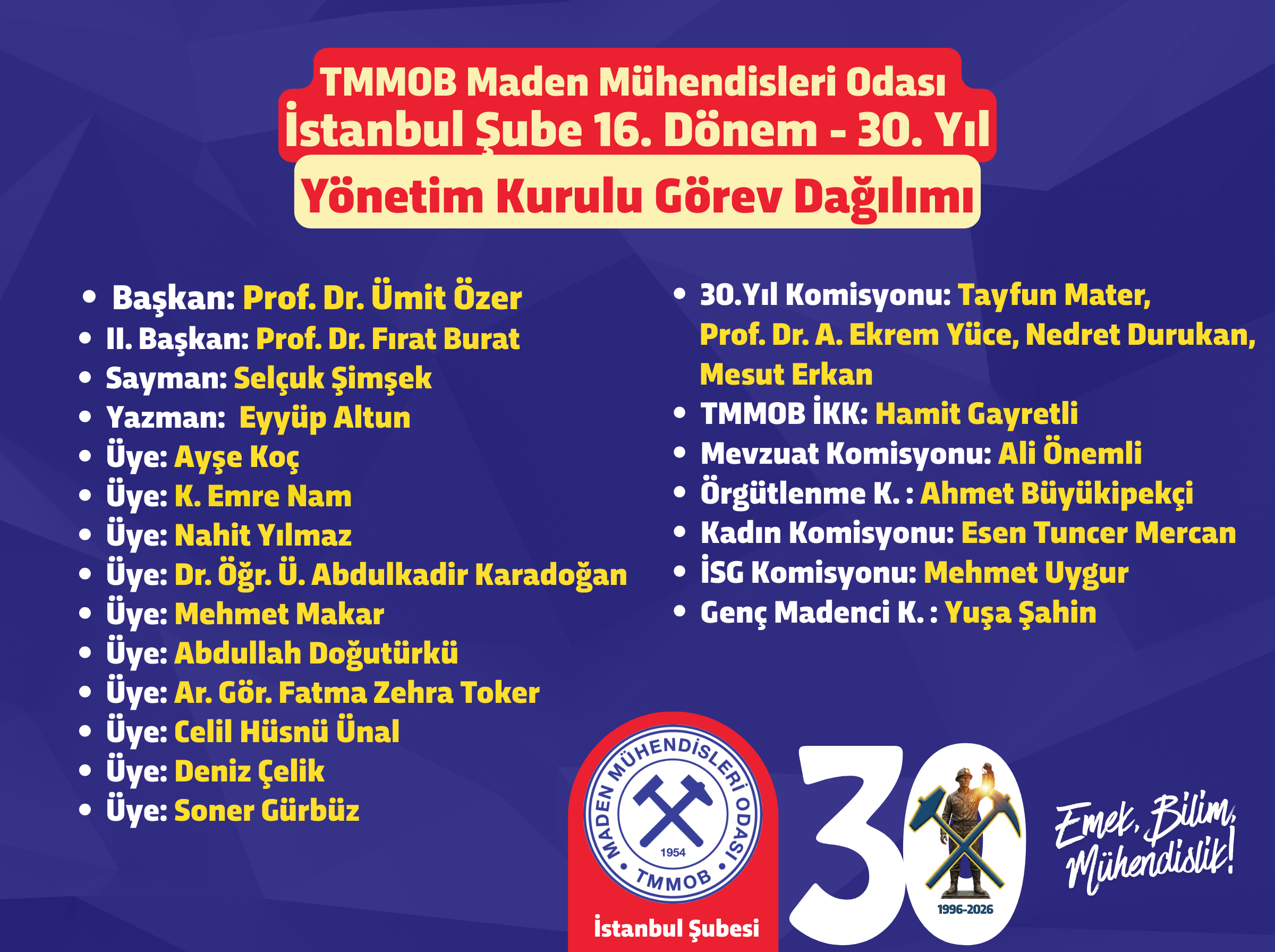 İstanbul Şube 16. Dönem – 30. Yıl Yönetim Kurulu & Komisyonları Görev Dağılımı