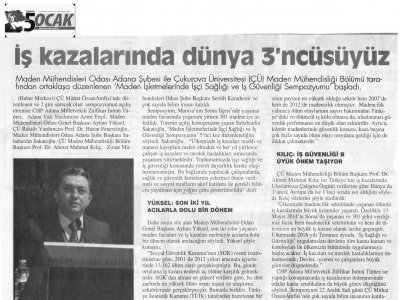 ÇÜ Maden Mühendisliği Bölüm Başkanı Prof. Dr. Ahmet Mahmut Kılıç ise Türkiye`nin iş kazalarında Uluslararası Çalışma Örgütü verilerine göre Dünya`da 3`üncü, Avrupa`da ise 1`inci sırada yer aldığını söyledi. Kılıç sözlerini şöyle sürdürdü: