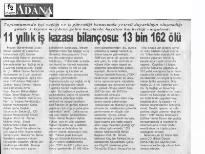 "Ülkemizde madencilik sektöründe yaşanan ölümlü iş kazalarında büyük üzüntüler yaşandı. Özellikle 13 Mayıs 2014`te Soma`da yaşanan ve 301 şehit verdiğimiz facia, hem madencilik sektörünün ve hem de ülkemizin en büyük iş kazası olarak tarihe geçmiştir. Ülkemizde 2016 yılı Temmuz ayında, ‘İş Sağlığı ve Güvenliği` uygulamaları devletin tüm kamu kurum ve kuruluşları ile ülkemizin bütününde uygulanmaya başlayacaktır. İş kazaları ve meslek hastalıklarının önlenmesinde; Devlet, işveren ve çalışanlara büyük görevler düşmektedir." CHP Adana Milletvekili Zülfikar İnönü Tümer ise yaptığı konuşmasında iş kazalarının önlenmesinde odalar kadar sendikalara da büyük görev düştüğünü söyledi.