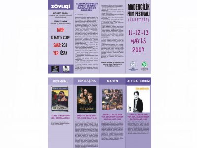Madencilik Film Festivali 13 Mayıs 2009 Çarşamba günü saat 9,30 da ÜSAM Konferans Salonunda Oda Başkanımız Mehmet TORUN ve Maden İşçileri Sendikası Danışmanı Fikret SAZAK ‘ın da katılacağı "MADENCİLER KENDİLERİNİ ANLATIYOR" konulu söyleşi ile son bulacaktır.