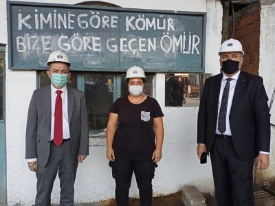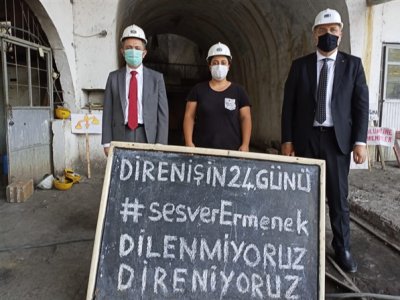 TMMOB Maden Mühendisleri Odası adına Oda Başkanımız Ayhan YÜKSEL ile Adana Şube Başkanımız Mehmet YILMAZ ’dan oluşan heyet 23 Eylül 2020 tarihinde, Ermenek’te 13 aylık maaşlarını ve geçmiş yıllardan kalan kıdem tazminatlarını almak ve iş sağlığı güvenliği kurallarına göre çalışmak için direnen üyemiz Emel TUNÇDEMİR ile maden emekçilerini desteklemek amacıyla maden ocağını ziyaret ettiler.