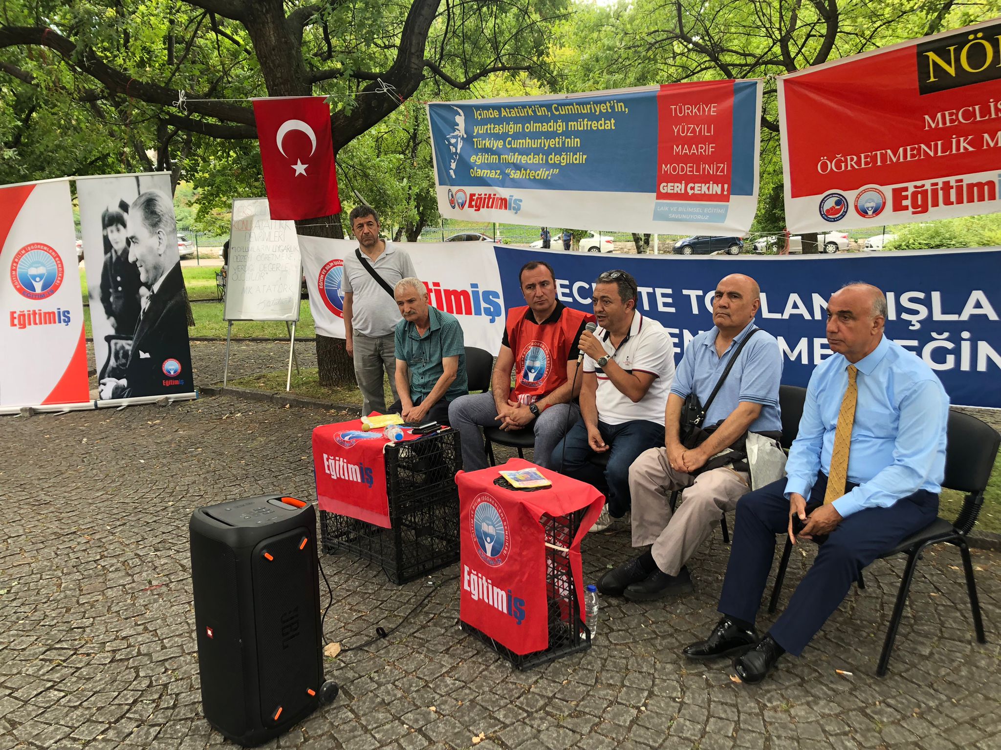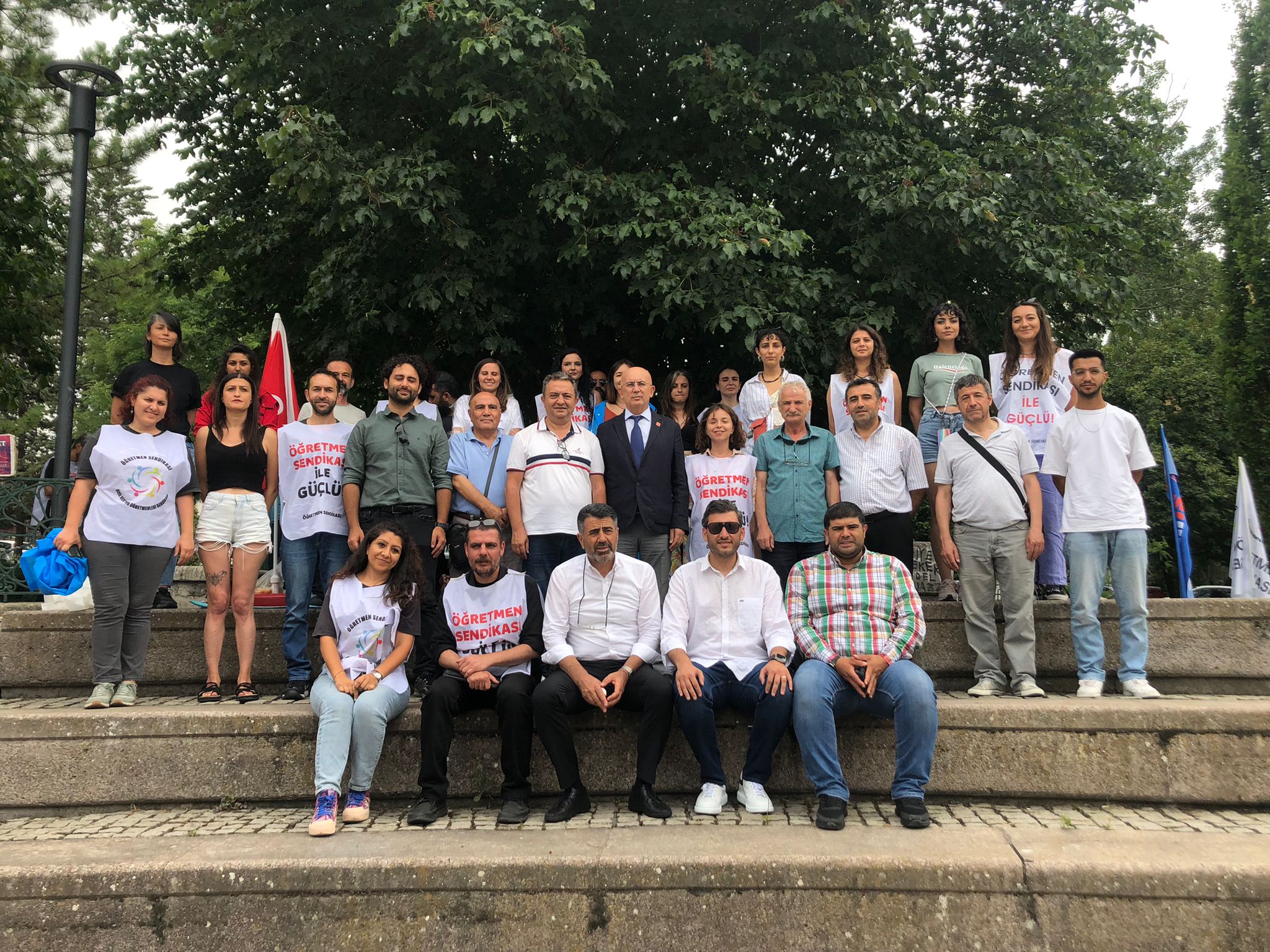 Mecliste görüşülmekte olan Öğretmenlik Meslek Kanununa “Haklarımızı ve taleplerimizi içermiyor” şiarıyla karşı çıkan KESK Eğitim ve Bilim Emekçileri Sendikası ve Eğitim İş, bunun yanı sıra kamuda olduğu gibi “Eğitim, Öğretim ve Bilim İşkolu” kurulması talebiyle Özel Sektör Öğretmenler Sendikası’nın meclis park bahçesinde sürdürdükleri mücadelelerini destekleme amacıyla 11 Temmuz 2024 Perşembe günü eğitim ve bilim emekçilerini ziyaret etmiştir. Ziyarete Odamız Yönetim Kurulu Başkanı Ayhan Yüksel, Sayman Üye Mehmet Zaman, Denetleme Kurulu Yedek Üye Eyüp Karaçalık, Genel Sekreter Yardımcısı Necmi Ergin odamız çalışanı Rıza Özden ve Serkan Yörük katılmışlardır.