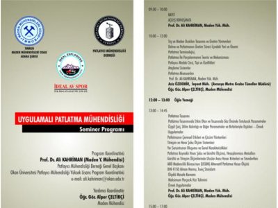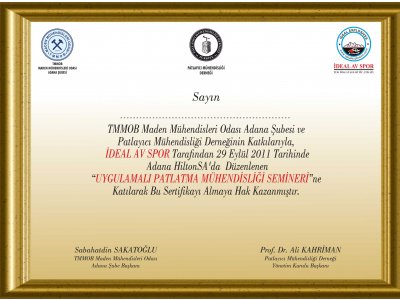 Maden Mühendisleri Odası Adana Şubesi ve Patlayıcı Mühendisliği Derneğinin katkılarıyla, İdeal Av Spor tarafından 29 Eylül 2011 tarihlerinde düzenlenen Patlatma Mühendisliği semineri yapılmıştır. Adana HiltonSA‘da düzenlenen Seminere çok sayıda üyemiz ve sektör temsilcisi katılmıştır. Bir gün süren seminerde patlatmanın teorisi, patlayıcı çeşitleri, çevresel sorunlar, patlatma tasarımı, patlatma verimliliği, patlayıcı maddeler tüzüğü ve iş güvenliği gibi konular anlatıldı. . Seminer sonunda katılımcılara katılım belgesi verildi.