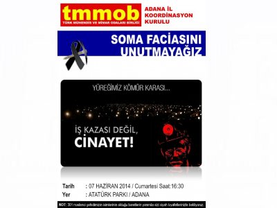 TMMOB Adana İl Koordinasyon Kurulu ile şubemizin ortaklaşa düzenlediği "SOMA FACİASINI UNUTMAYACAĞIZ" etkinliği 7 Haziran 2014 tarihinde Atatürk parkında üyelerimizin geniş katılımıyla gerçekleştirildi. Etkinlikte 301 maden emekçisinin anısına 301 baret sergilendi. 301 balon şehitler anısına gökyüzüne ( sonsuzluğa ) bırakıldı.