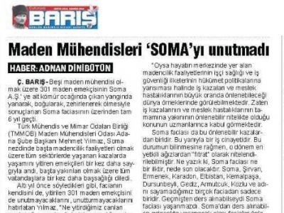 Soma faciasının olduğu gün “Somayı unutmayacağız, unutturmayacağız” sözü veren Odamız, Soma faciasının 6. Yıldönümünde etkinliklerini Covid-19 koşullarında sosyal medya ortamına taşımak zorunda kaldı. Bu kapsamda 13 Mayıs 2020 Çarşamba günü Adana Şube Başkanımız Mehmet YILMAZ basın açıklaması yaptı. Bu basın açıklaması 14.05.2020 tarihinde yerel basında geniş yer buldu.