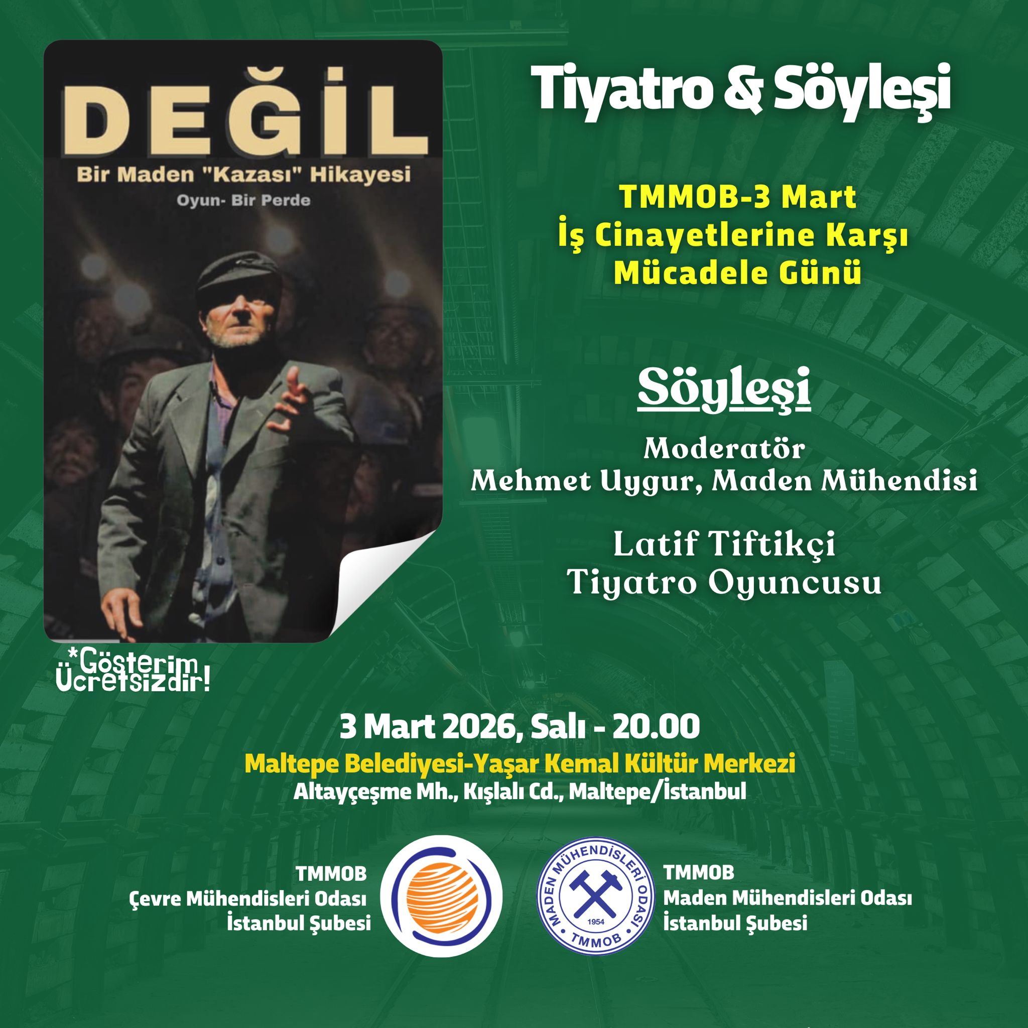 3 Mart İş Cinayetleri ile Mücadele Günü kapsamında düzenlediğimiz “DEĞİL” adlı tiyatro oyunu gösterimine tüm dostlarımız davetlidir.