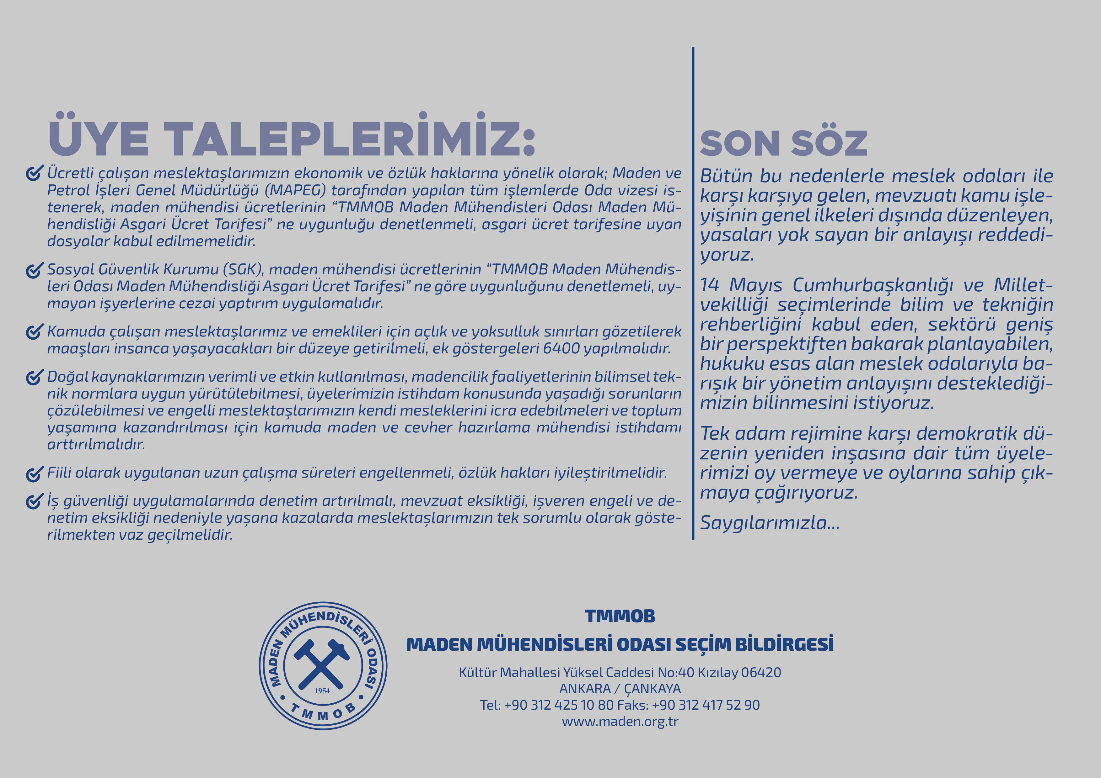 14 Mayıs 2023 Pazar günü Ülke tarihinin en önemli Cumhurbaşkanı ve Milletvekilliği Genel Seçimleri yapılacaktır. Bu seçimler ve sonrasında karşılanmasını beklediğimiz taleplerimiz, yayımladığımız “TMMOB Maden Mühendisleri Odası Seçim Bildirgesi”nde belirtilmiştir.